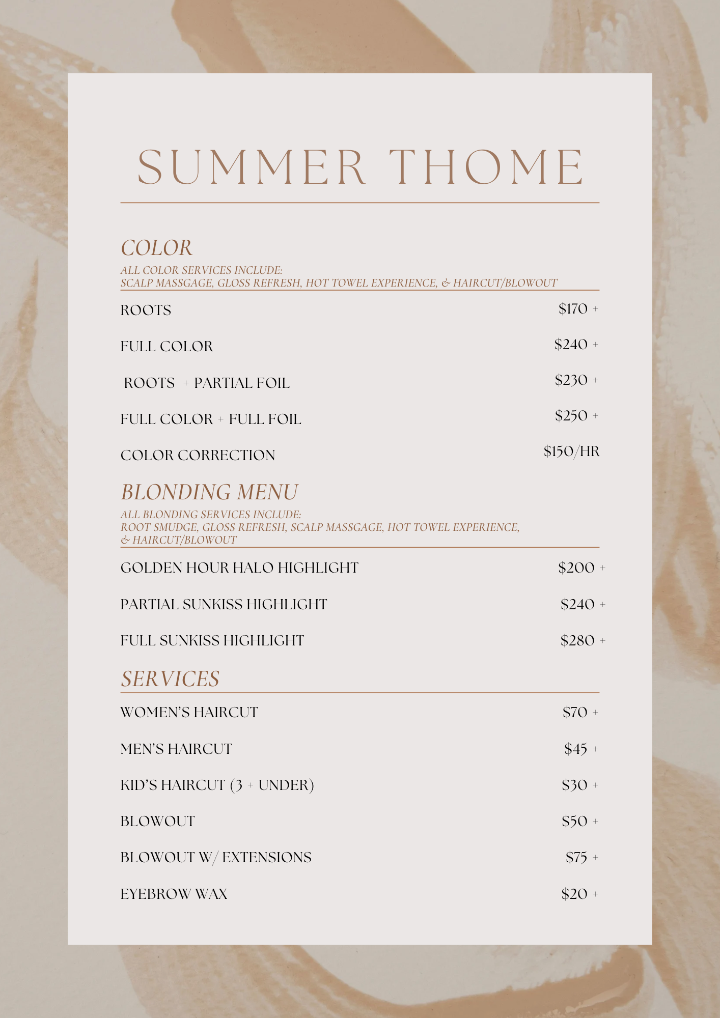 BLONDING MENU BECAUSE NO BLONDE IS ONE SIZE FIT’S ALL “SUMMER ALWAYS PROVIDES A TOP-NOTCH SERVICE. MY COLOR + HAIRCUTS ARE ALWAYS SPOT ON. THE EXPERIENCE SHE PROVIDES KEEPS ME COMING BACK!”JANE B.